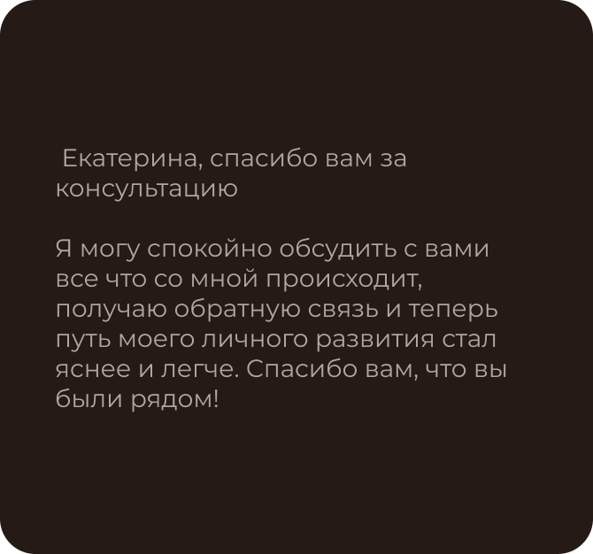 Женщина 28 лет — обратилась с запросом "окружающие думают обо мне плохо», что вызывало патологическую тревогу. Было проведено 6 сессий, в ходе которых клиент научилась смещать фокус на себя, также клиент обучилась навыкам самопомощи при тревожных мыслях, появилось понимание личных границ.